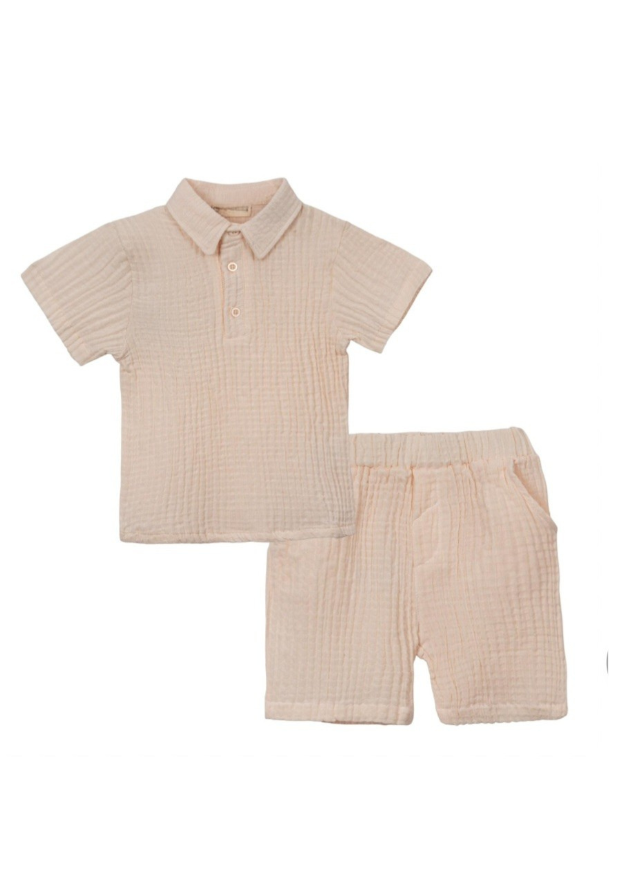 Keep your little one comfortable and stylish with our Organic Muslin Cotton Polo & Shorts Set. Crafted from ultra-soft, breathable organic muslin cotton, this set is perfect for warm days and active play. The short-sleeve polo shirt features a classic collar and button placket for a polished yet casual look, while the elastic waist shorts offer easy wear and all-day comfort.