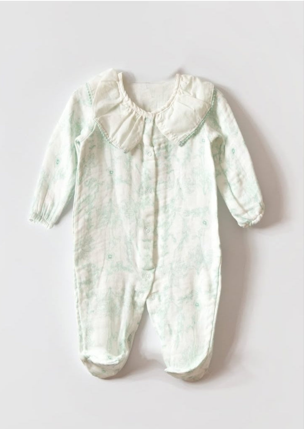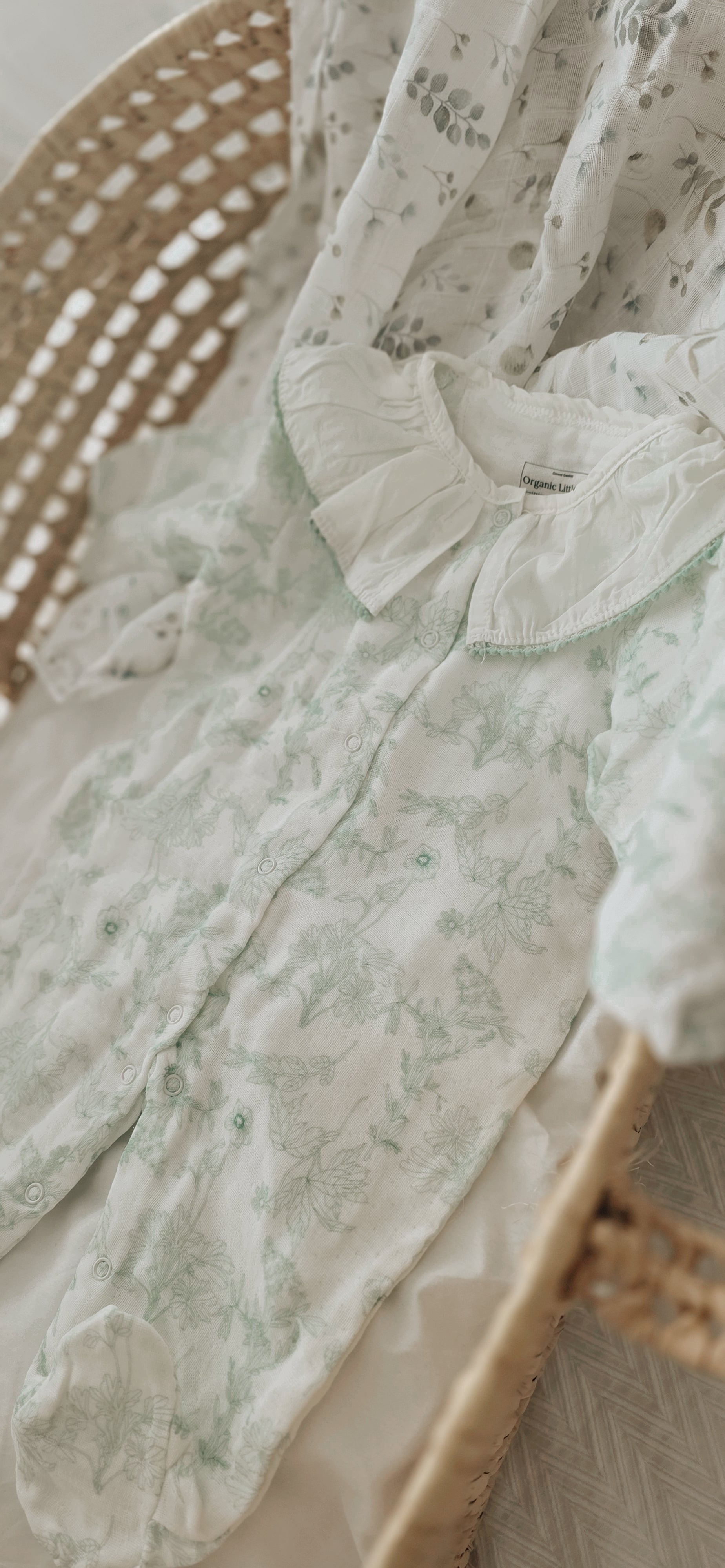 Organic Baby Muslin Romper — Mint Green Floral Summer Sleepsuit