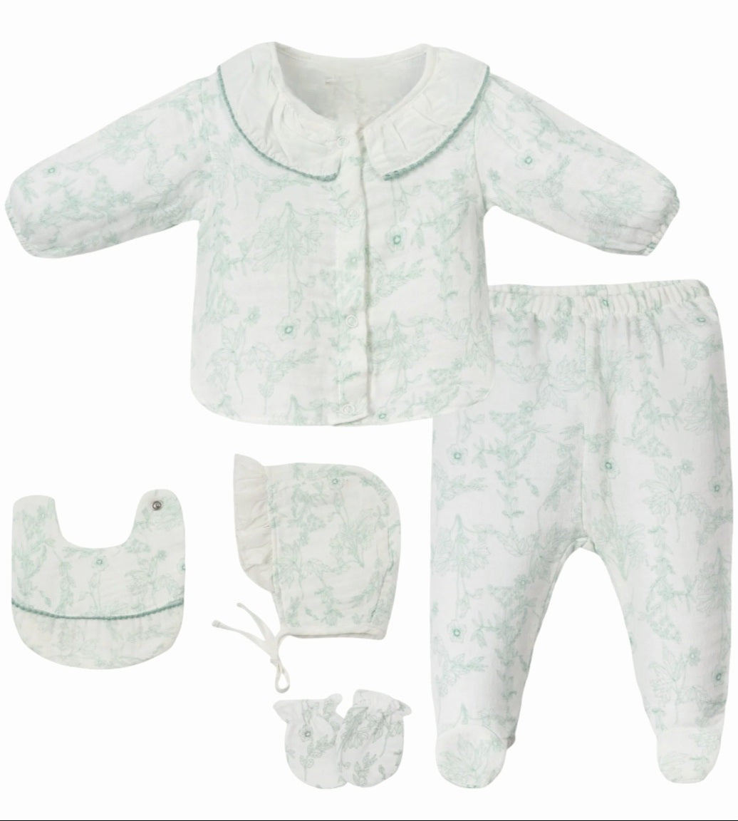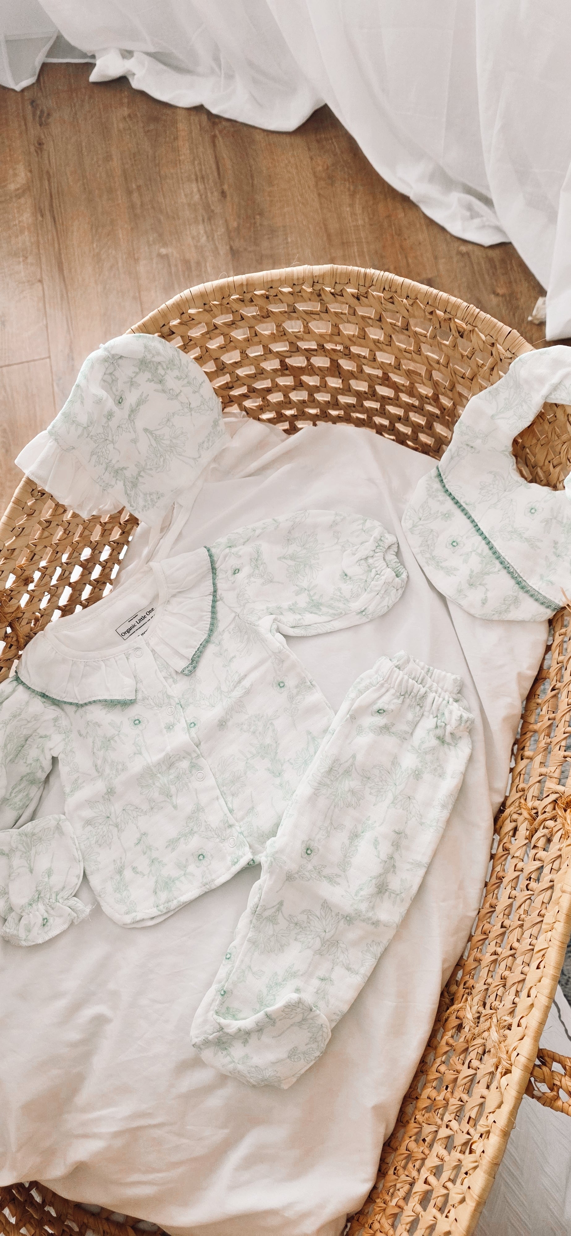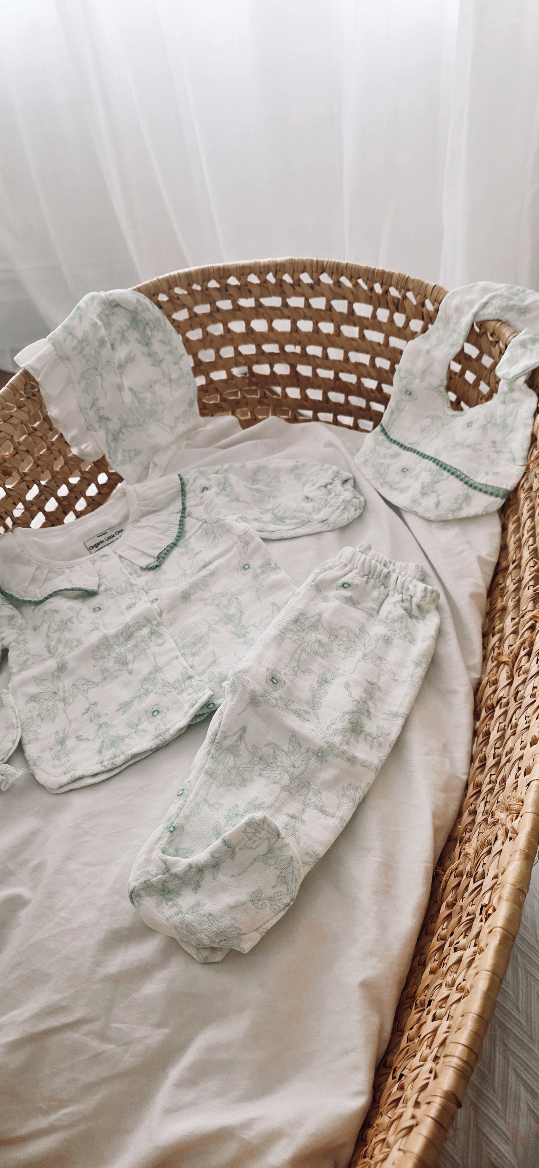 Welcome your baby with the gentle touch of nature. The Organic Little One Newborn Complete Set is crafted from ultra-soft, breathable organic cotton muslin, ensuring delicate comfort for your little one's sensitive skin. Naturally dyed with plant-based, eco-friendly colors, this thoughtfully designed 5-piece set includes a charming bonnet, bib, mittens, top, and pants — perfect for keeping your baby cozy from day one. Each piece is light and airy, allowing optimal airflow to keep your newborn cool and comfortable, while the delicate floral design adds timeless charm.