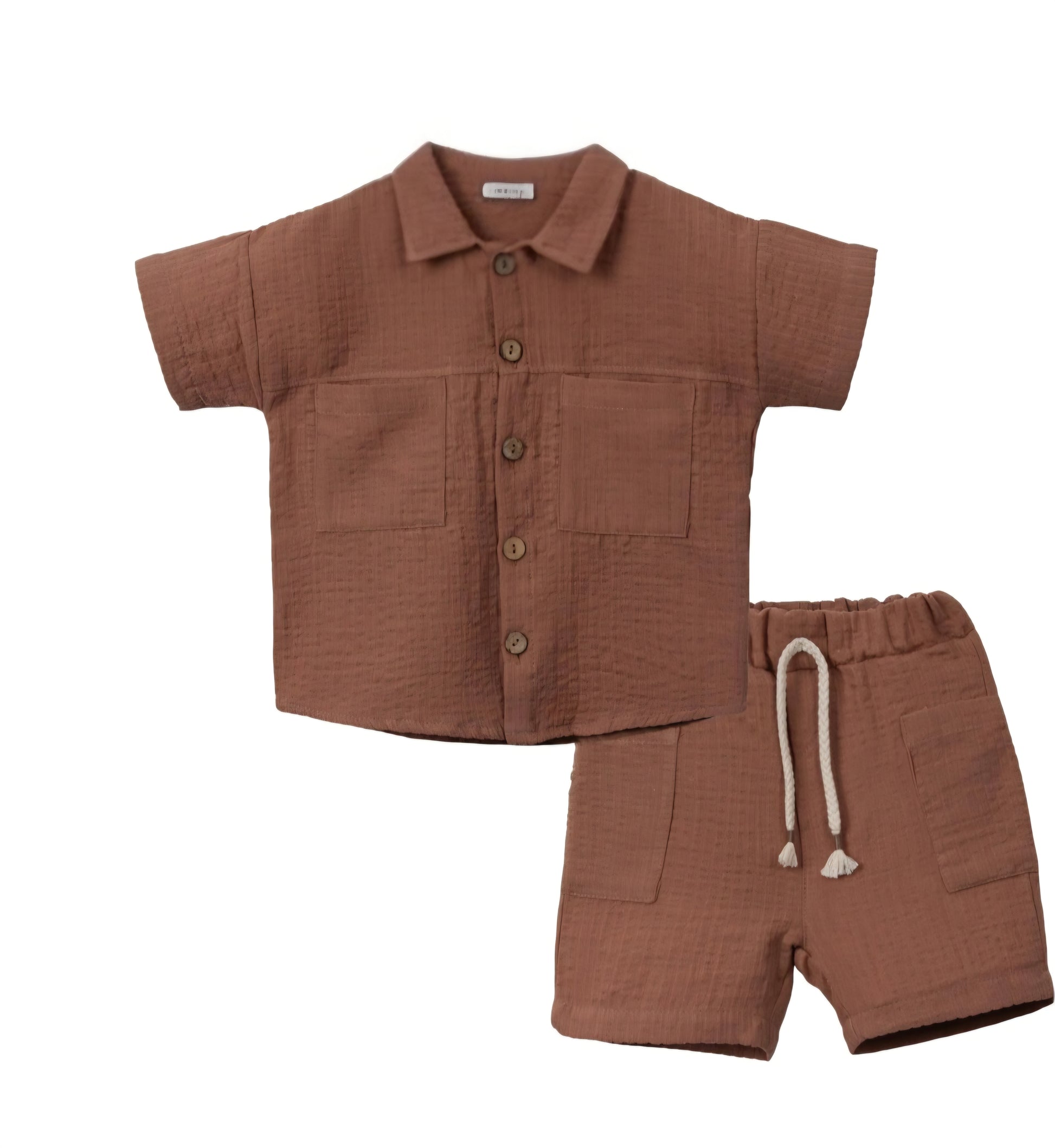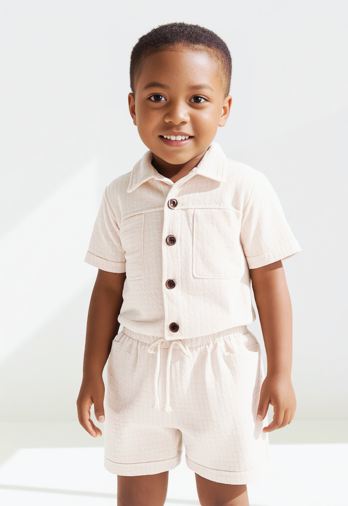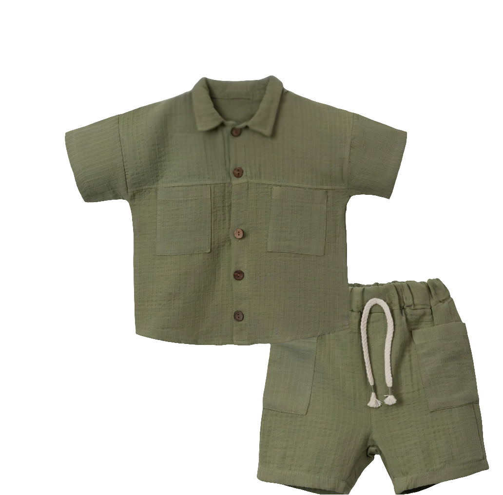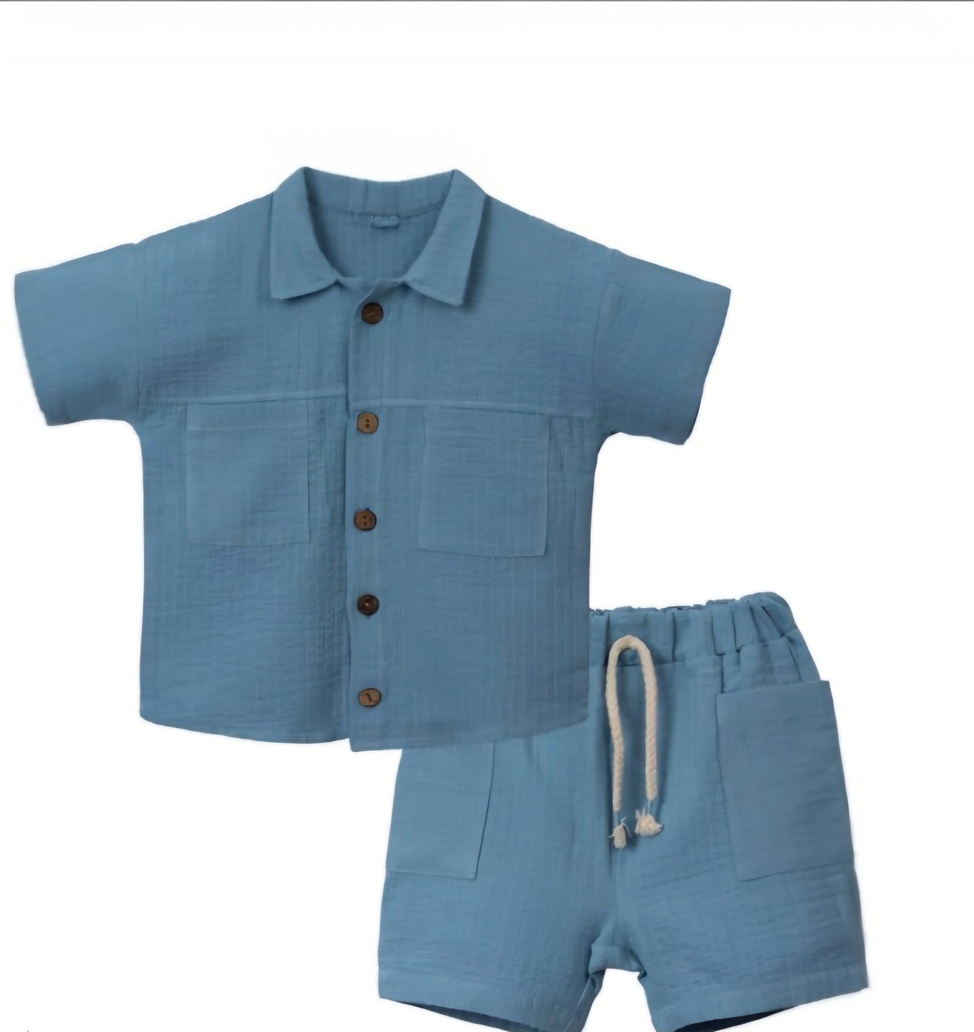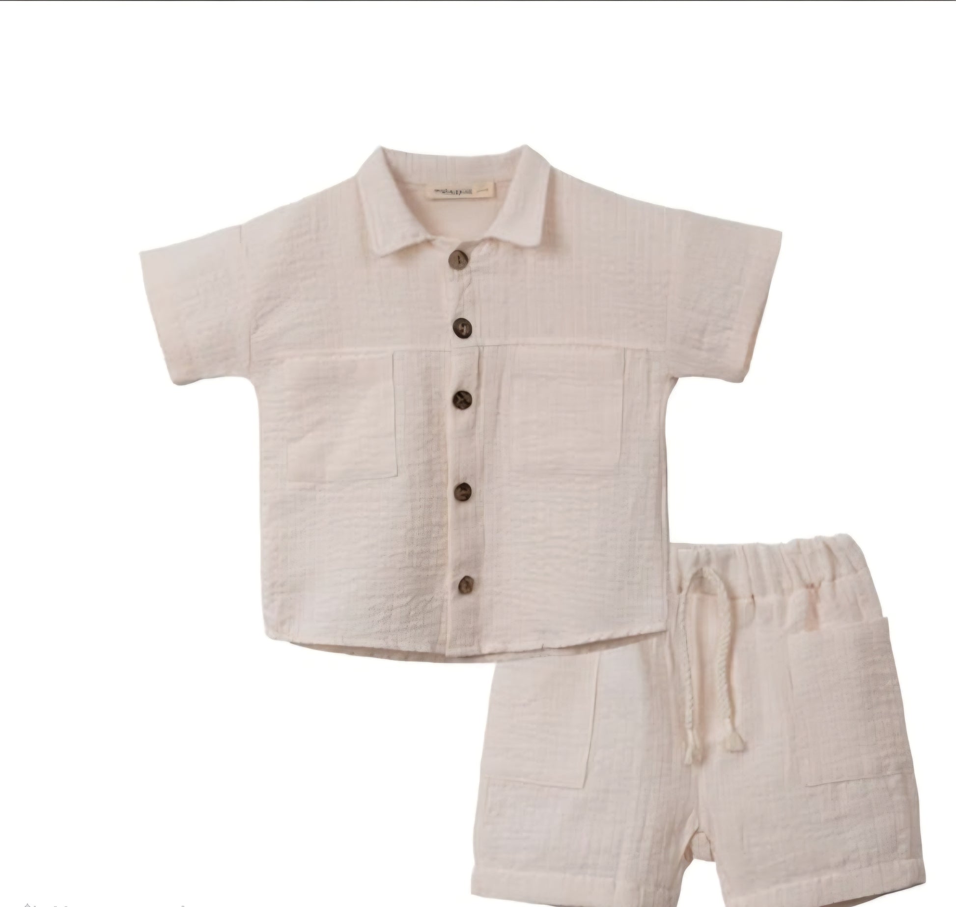 Keep your little one cool and stylish all summer long with our Organic Muslin Cotton Baby Summer Shorts Set. This soft, breathable 2-piece outfit includes a short-sleeve button-up shirt with front patch pockets and matching elastic-waist shorts with a functional drawstring.