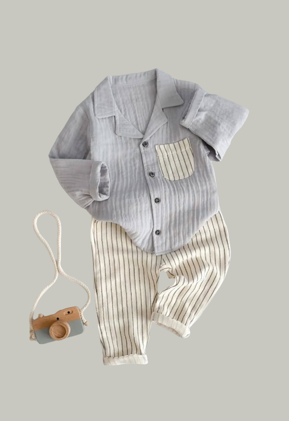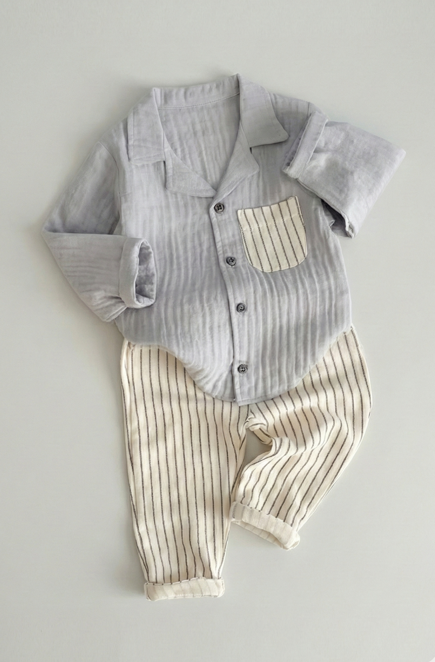 The lightweight grey button-up shirt features a charming striped pocket detail, paired perfectly with cream striped trousers. A relaxed, gender-neutral silhouette ideal for warm days, playdates, and seaside strolls.