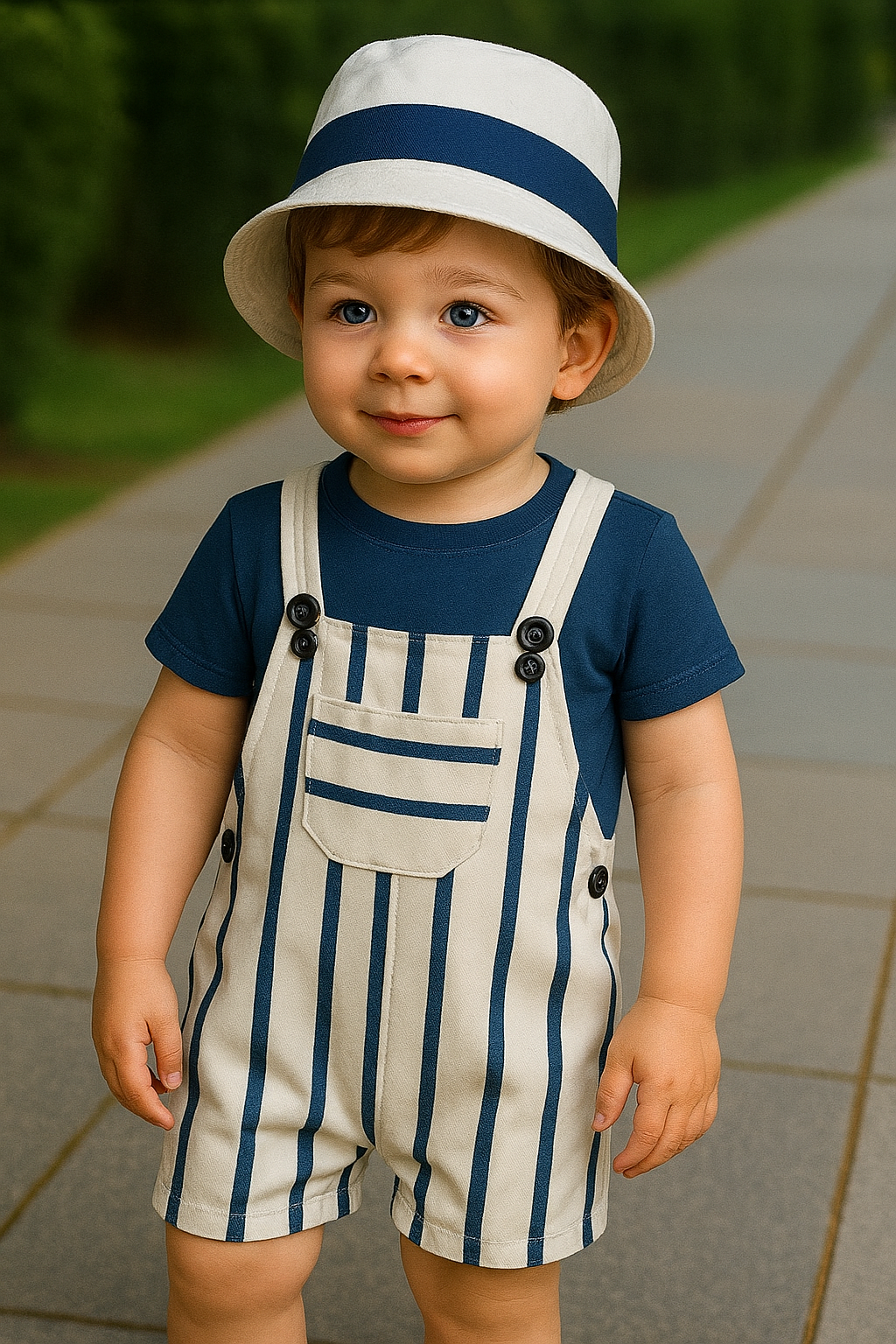 Crafted from breathable organic cotton French terry, Navy blue vertical stripes give this romper a crisp, classic look, while the coordinating bucket hat ties the outfit together. Designed for comfort, play, and picture-perfect moments.
