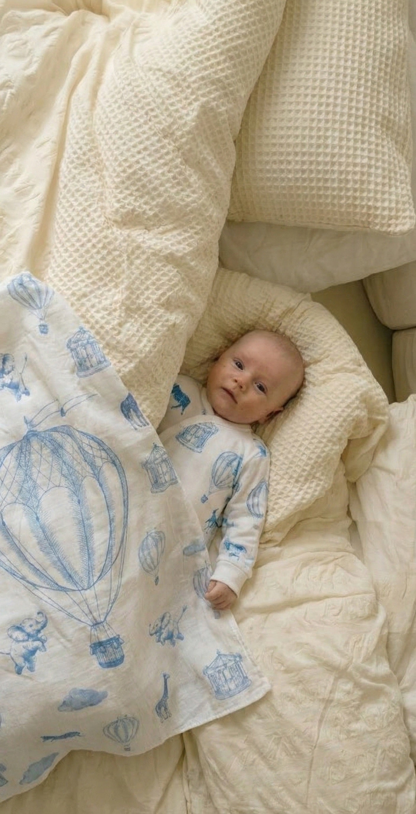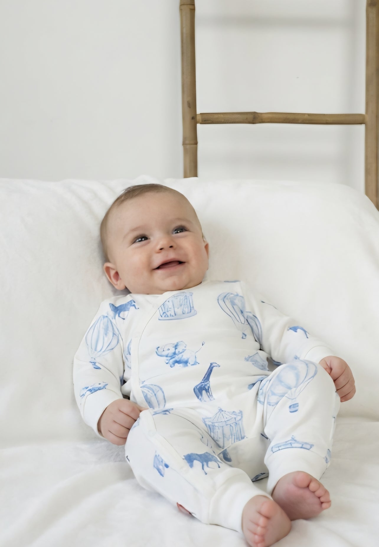 Wrap your little one in dreamy comfort with our Safari Hot Air Balloon Sleepsuit - where imagination takes flight. Featuring hand-illustrated safari animals, whimsical hot air balloons, and carousel details in soft sky blue, this timeless piece is perfect for sweet adventures day or night.