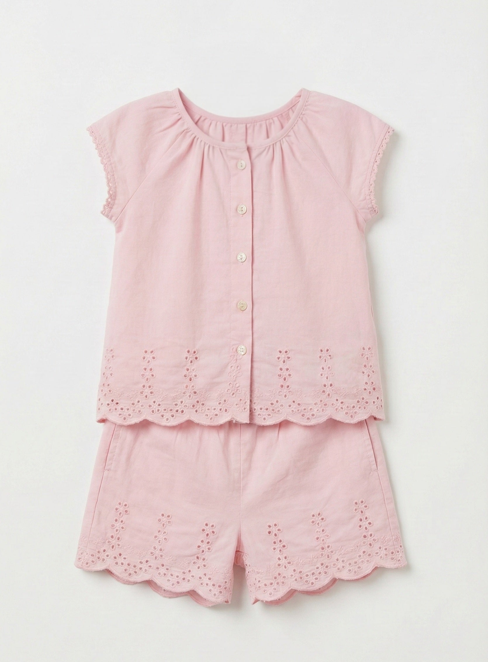 Keep her cool and effortlessly stylish with this beautifully crafted broderie anglaise short set, designed especially for toddler and young girls. Made from soft and breathable cotton, this charming set includes a delicate cap-sleeved button-down top and matching scalloped hem shorts, both adorned with intricate broderie anglaise embroidery for a touch of timeless elegance.