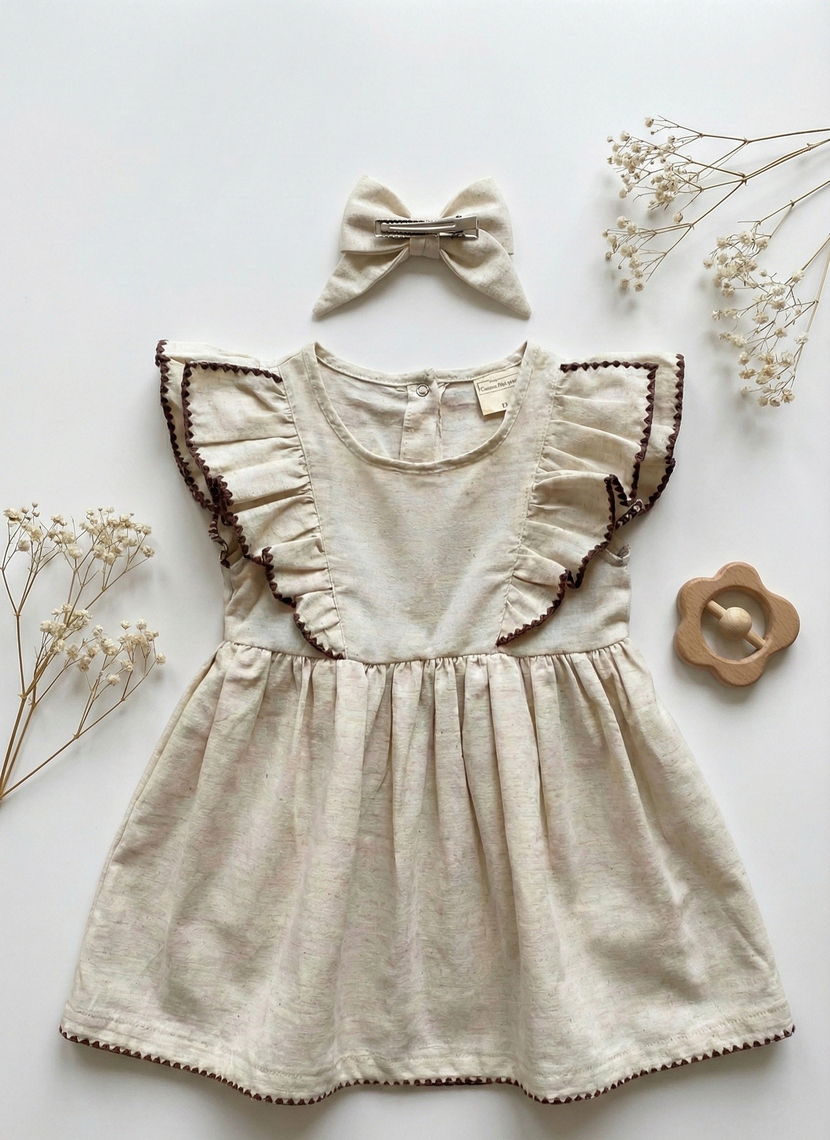 Dress your little one in timeless charm with our Linen Ruffle Baby Girl Dress & Hair Clip Set. Thoughtfully crafted from soft, breathable fabric, this adorable dress offers both comfort and style — perfect for sunny days, family gatherings, or casual playdates.