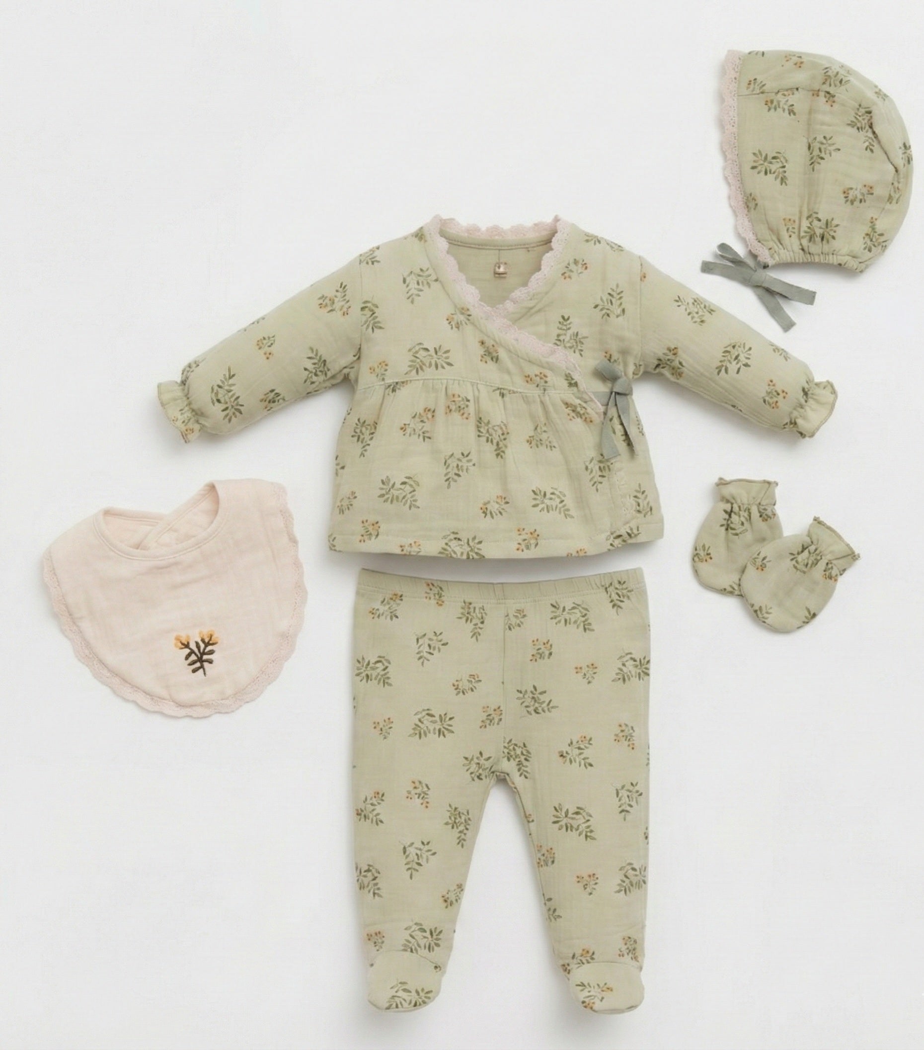 Wrap your newborn in gentle comfort and timeless charm with our Olive Meadow Newborn Set. Lovingly crafted from the softest GOTS-certified organic muslin cotton, this 5-piece set is the perfect blend of beauty and practicality for your little one's first days.