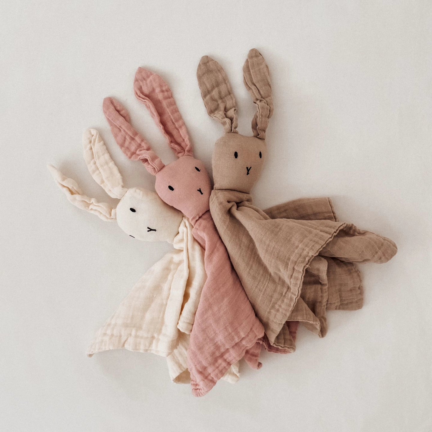 Our adorable little bunnies are here to comfort your little one, your baby's new best friend. For those sad and happy days this cuddle comforter is always handy, made from organic cotton this bunny is made to last.
