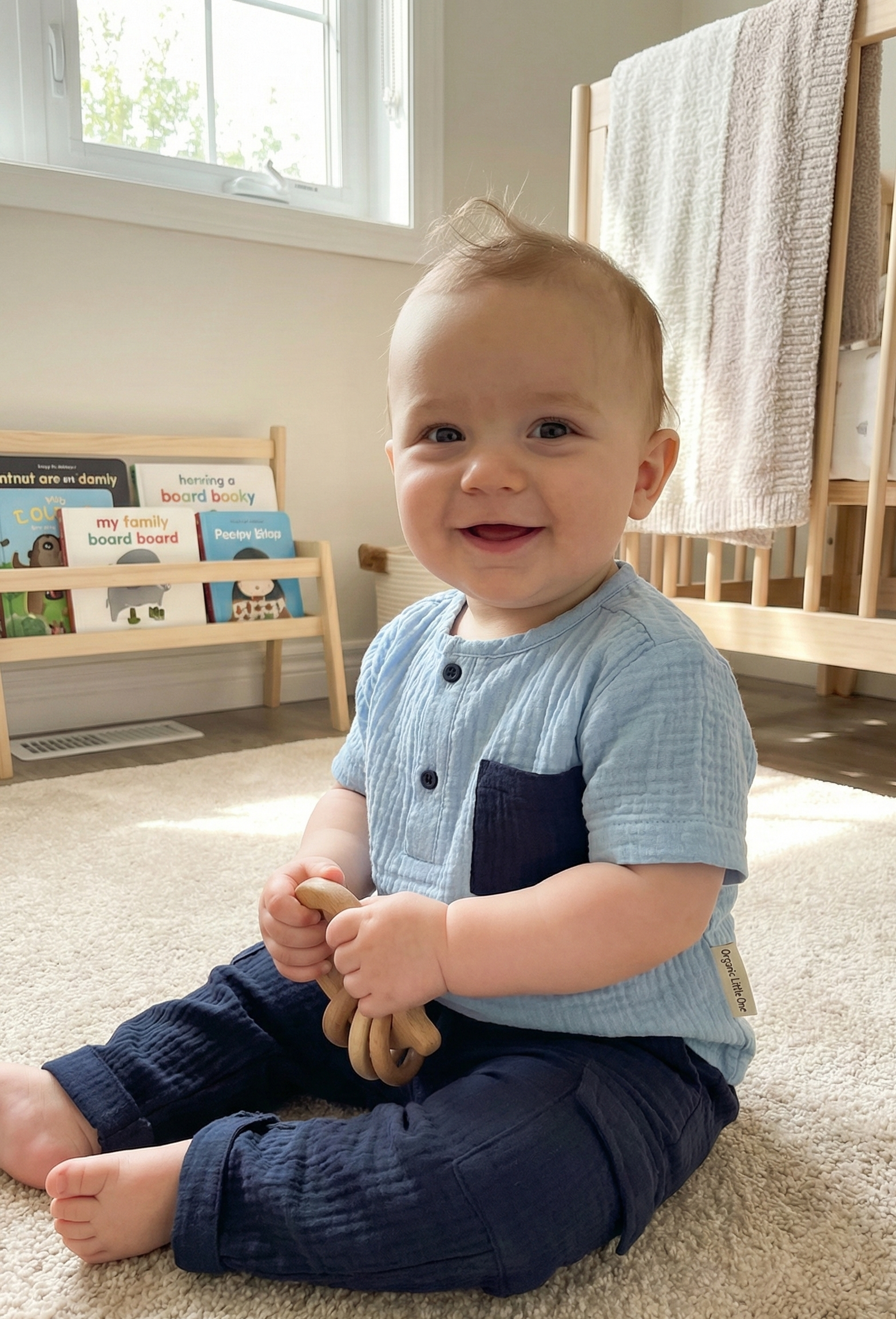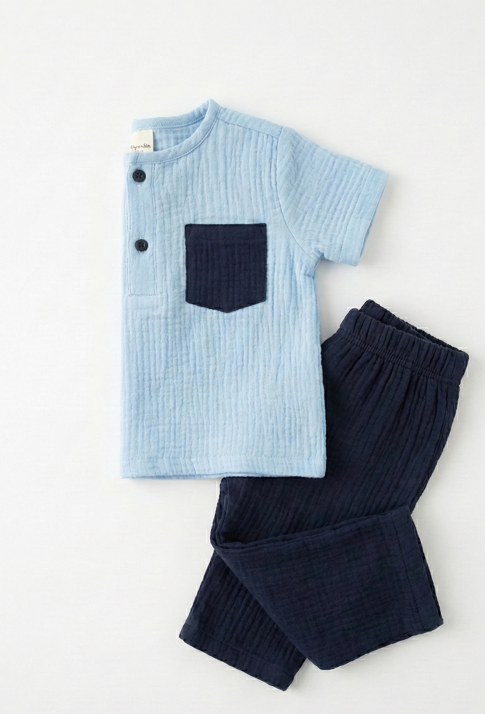 Keep your little one stylish and comfortable with our Organic Muslin Cotton Set, thoughtfully crafted for baby boys This charming two-piece outfit includes a soft, breathable short-sleeve top and matching pants, both made from premium organic muslin cotton that’s gentle on delicate skin.