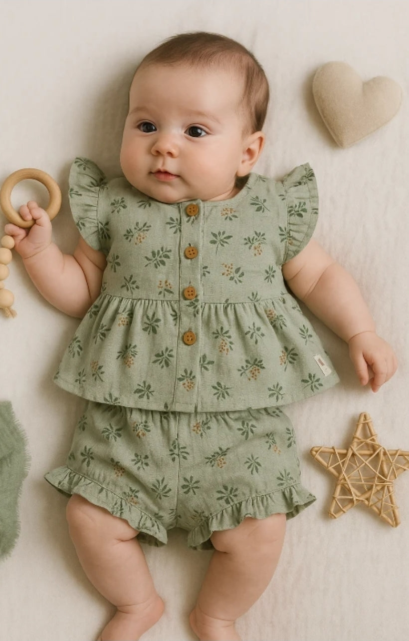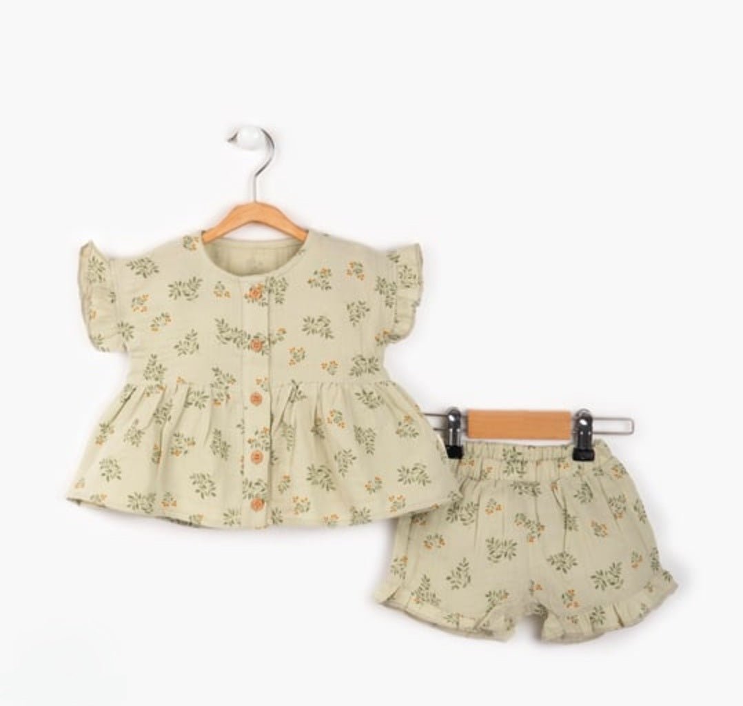 A soft and breathable two-piece baby set made from 100% GOTS-certified organic muslin cotton. Designed for style and comfort, this outfit features a flutter-sleeve button-down top with a gently flared hem and matching ruffle-trim shorts-perfect for warm days or layering.