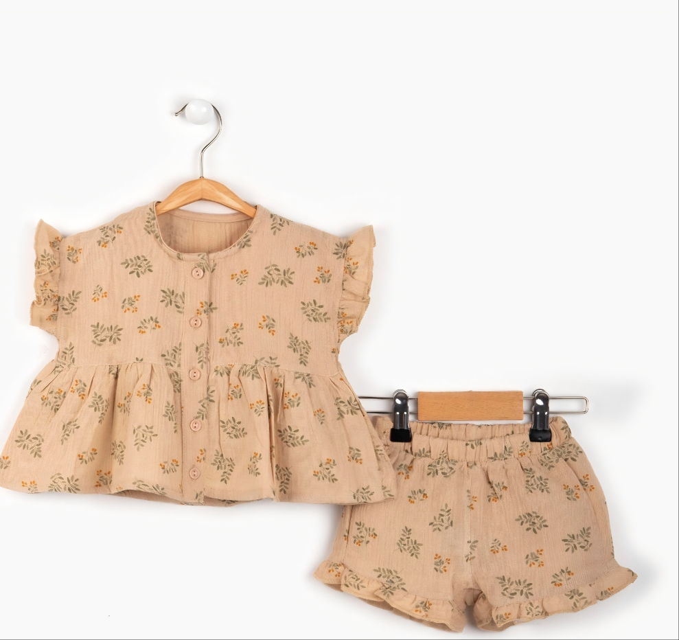A soft and breathable two-piece baby set made from 100% GOTS-certified organic muslin cotton. Designed for style and comfort, this outfit features a flutter-sleeve button-down top with a gently flared hem and matching ruffle-trim shorts-perfect for warm days or layering.