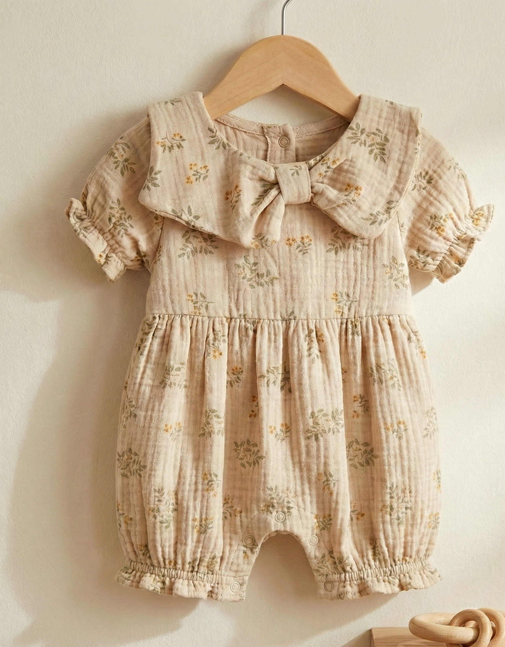 Featuring a subtle all-over floral print and a statement oversized collar finished with a soft bow detail, this romper blends vintage charm with everyday practicality. The lightly gathered silhouette allows little ones to move freely, while elasticated cuffs and discreet snap fastenings make dressing and changing effortless.